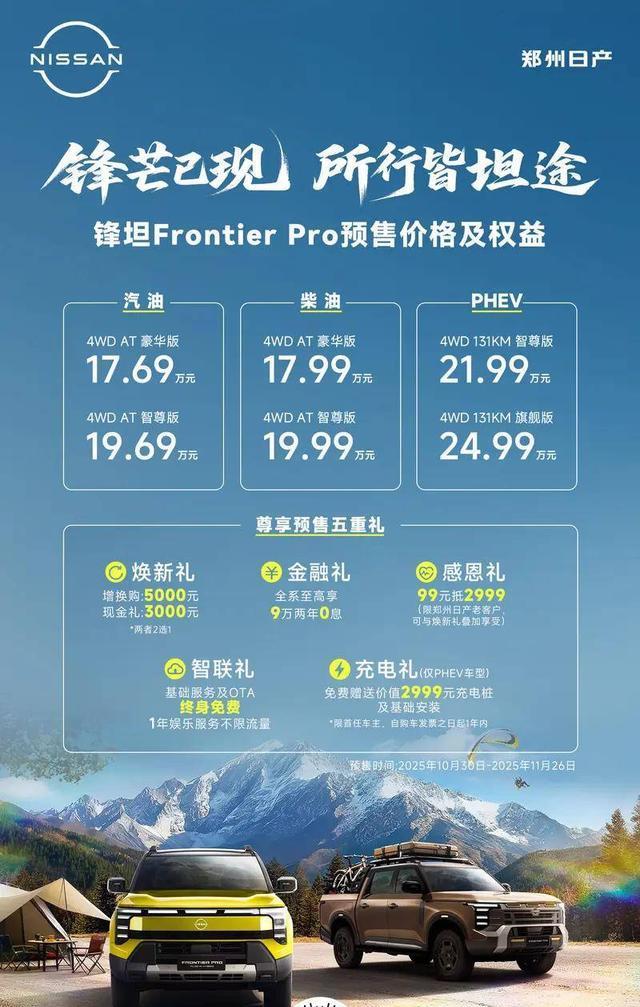 日前盘配资,我们从相关渠道获悉,郑州日产旗下全新皮卡车型——锋坦Frontier Pro将在11月27日晚间正式上市,此前公布的预售价区间为17.69-24.99万元。新车是日产首款在中国设计、研发和生产的全球车型,与日产Z9采用相同平台设计,动力部分将提供汽油、柴油以及插电混动供选。
