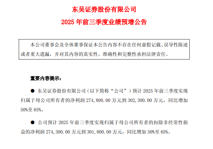 10月14日,东吴证券发布公告,预计2025年前三季度归属于母公司所有者的净利润为27.48亿元至30.23亿元,同比增加50%至65%。