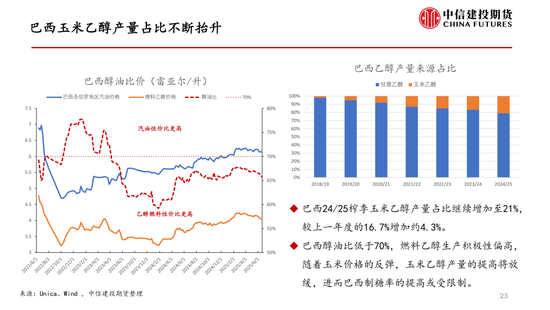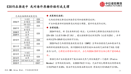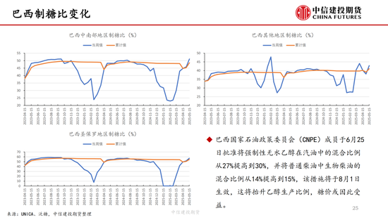 此外,巴西国家石油政策委员会成员于6月25日批准将在8月1日强制性无水乙醇在汽油中的混合比例从27%提高到30%,并将普通柴油中生物柴油的混合比例从14%提高到15%,这将为燃料乙醇带来一定的供应缺口,或抬升乙醇生产比例,进而糖价或因此受益,因此巴西制糖比是观测上的重点指标,可阶段性证实或证伪巴西E30推行带来的实际影响。