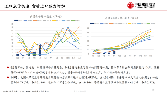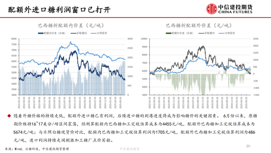 我国国内夏季到来高温来袭,下游备货需求释放,市场成交氛围回暖。但随着前期国际原糖价格下跌,我国配额外进口利润窗口已打开且进一步走扩,进口端的供应压力逐渐释放。海关数据,5月份我国进口食糖35万吨,同比增加33.31万吨,其中关税配额外原糖实际到港21万吨。截至6月15日发布的相关数据显示,6月预报到港24.9971万吨,7月预备到港25.1166万吨。