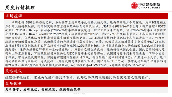 策略推荐:短期偏中性运行,重点关注进口糖到港节奏,此外巴西双周报制糖比的变化是重点观测指标。