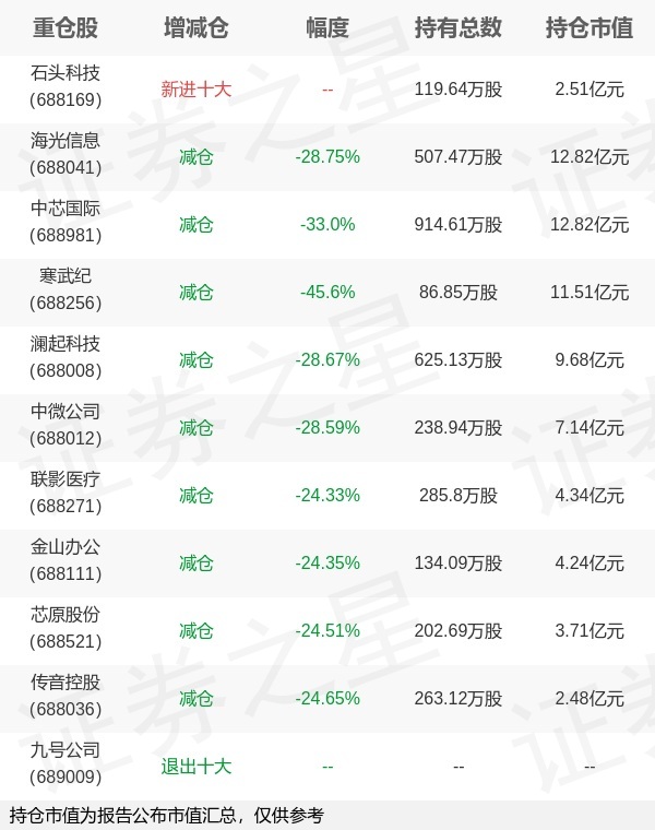 本站消息,10月28日工银瑞信基金旗下赵栩管理的工银瑞信上证科创板50成份交易型开放式指数基金公布三季报,近1年净值增长率49.32%。与上一季度相比K线猎手,该基金前十大重仓股新增石头科技;其中海光信息持仓占比10.42%,为该基金第一大重仓股;九号公司等退出前十大重仓股;详细数据如下: