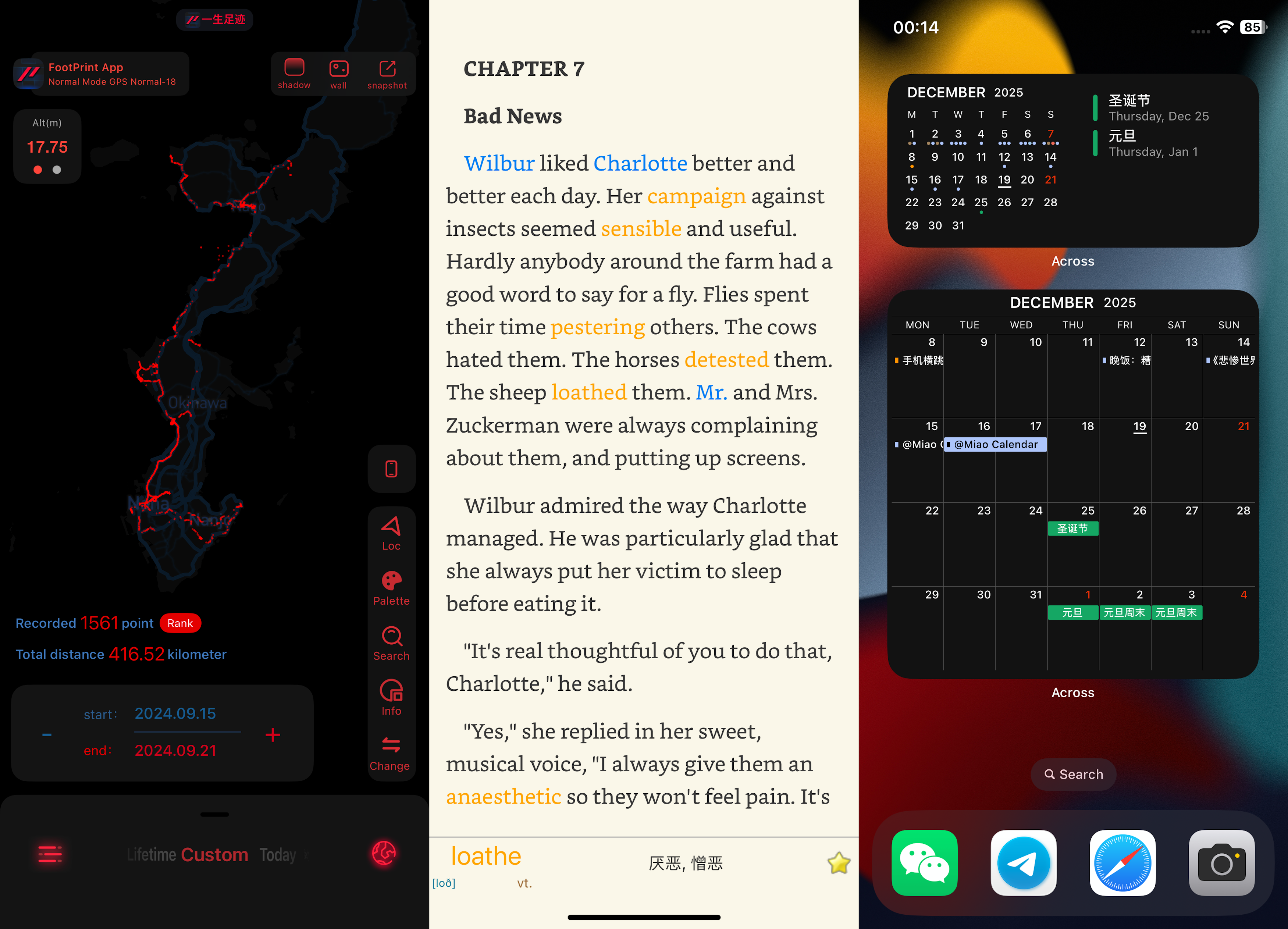 我也确实发现了一些在安卓上没有满意替代品的 app,让我对 iPhone 产生了一些牵挂,例如足迹应用 FootPrint(免费功能已足够我使用)、英语阅读利器蒙哥阅读器(胜在便宜)、日历应用 Across(视图很丰富、小组件很美丽)等。还有的 app 明明双平台都有,可在 iOS 上小组件小巧精致,在安卓上就是个傻大黑(说的就是你,极简汇率!)。