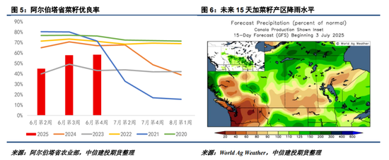 受益于半个月左右的降雨改善,加菜籽产区优良率环比提升,但仍低于5年及10年均值水平。整体来看加菜籽土壤偏干局面得到一定缓解,短期内天气端暂无明显异动。不过,随着北美进入7-8月的传统高温季节,加拿大仍有可能在后期出现山火风险。