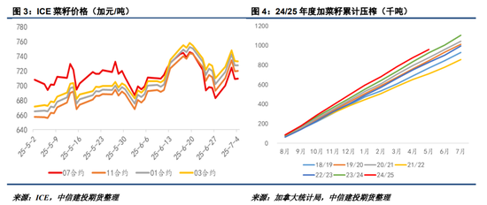 ICE菜籽受美国生物柴油及经贸题材影响,近期出现明显波动,但整体上已经体现出“近弱远强”局面。由于美国生物柴油政策历经几轮反复,虽有需求提振预期,但已经错过加菜籽春播时节,25/26年度加菜籽播种面积同比下降20万公顷至866万公顷。在面积下滑背景下,预计25/26年度加菜籽产量难有明显扩张,叠加需求转好预期,市场对ICE菜籽新季合约持乐观态度。从压榨数据来看,25年5月加菜籽压榨下滑至83.1万吨,这主要是因为旧作供给偏紧导致的,但24/25年度加菜籽累计压榨仍达到95.9万吨,为历年来最高水平。